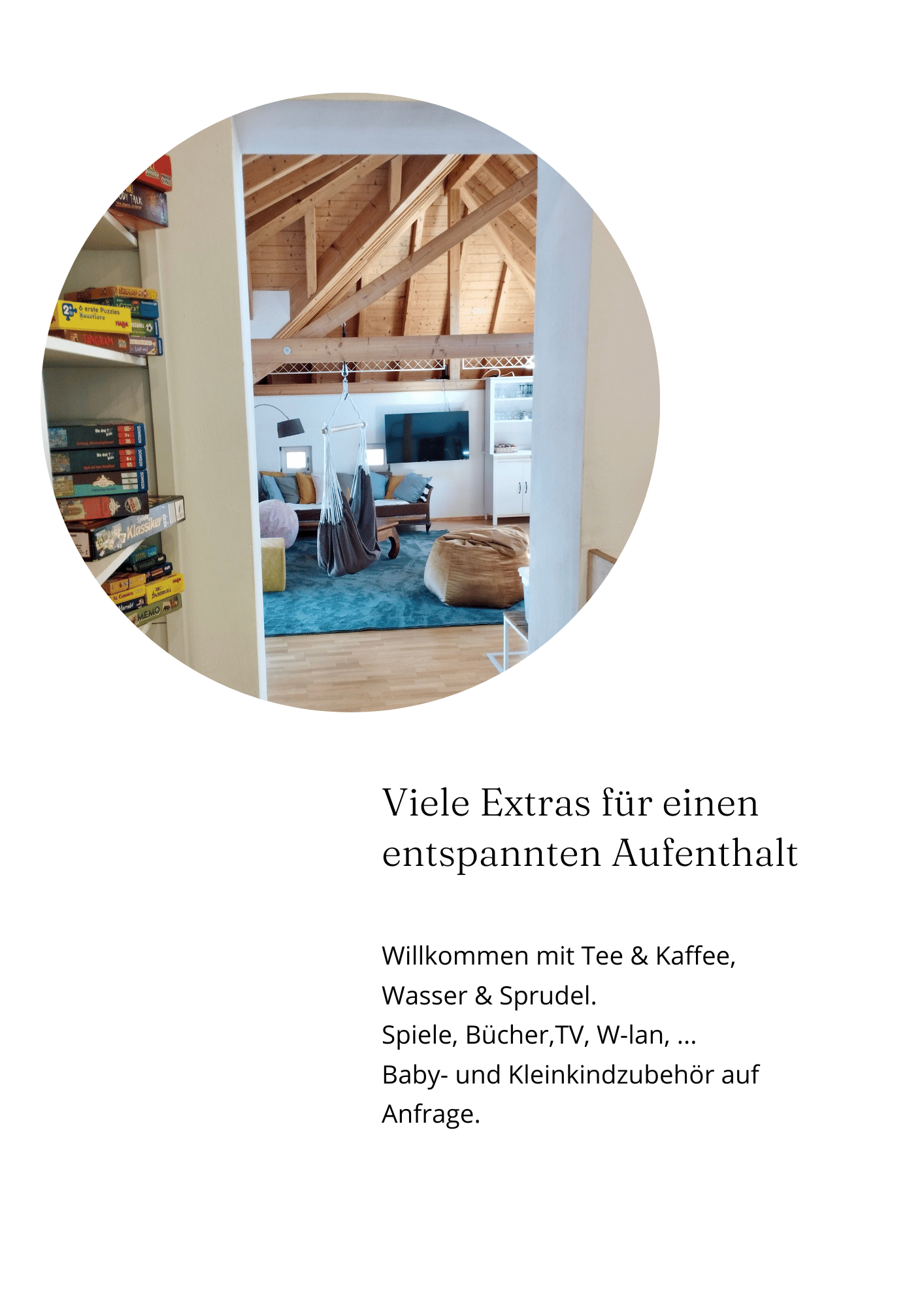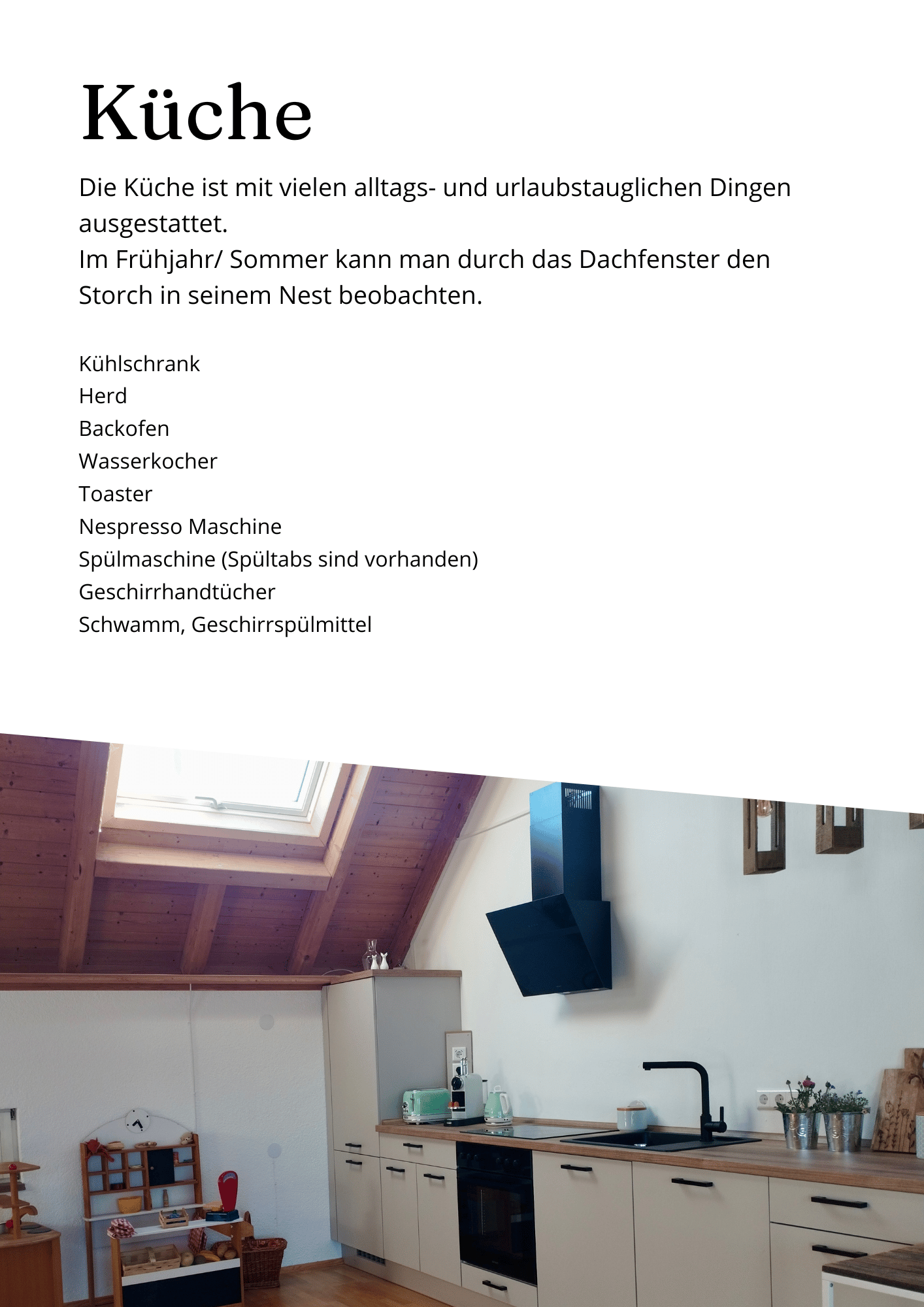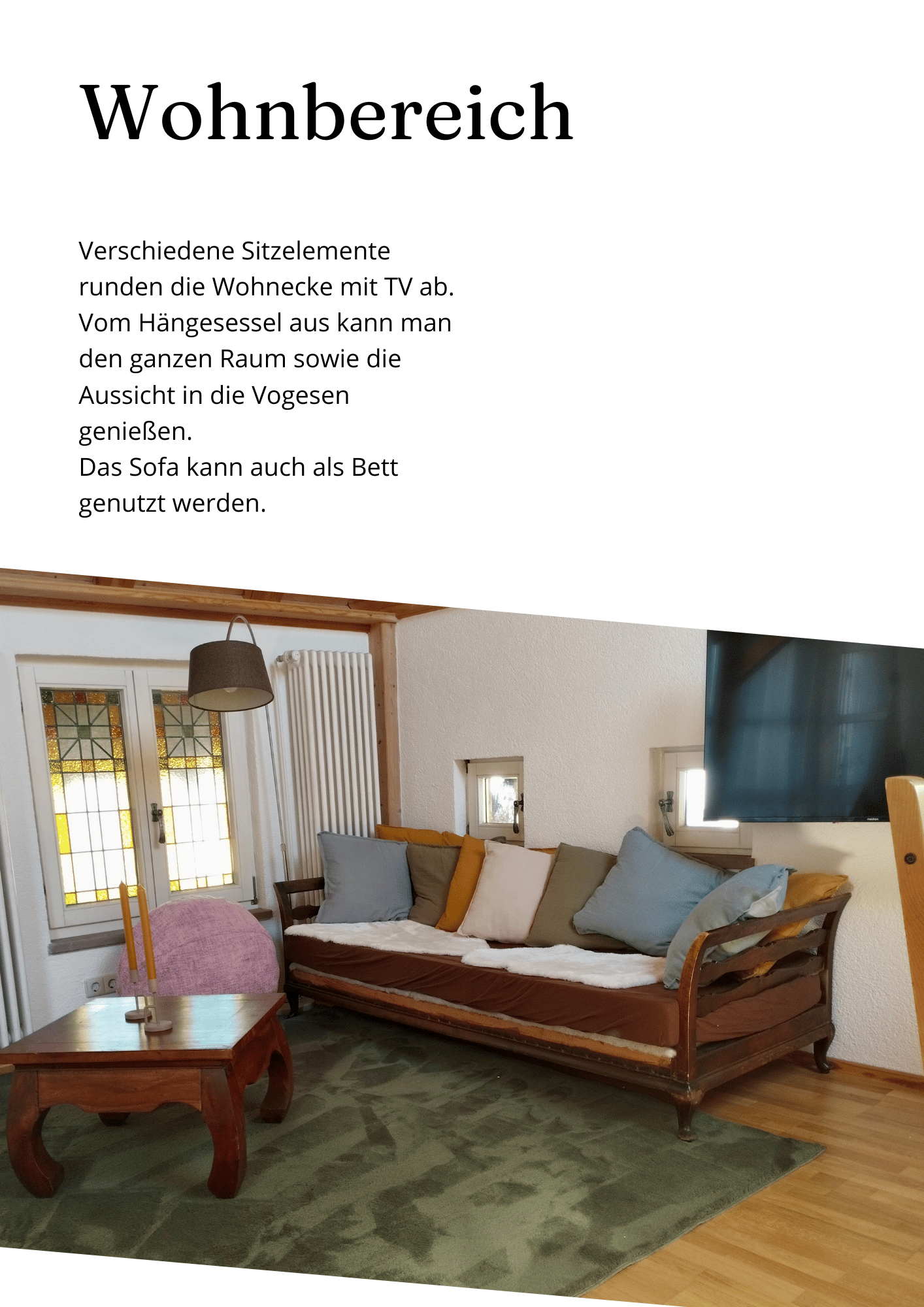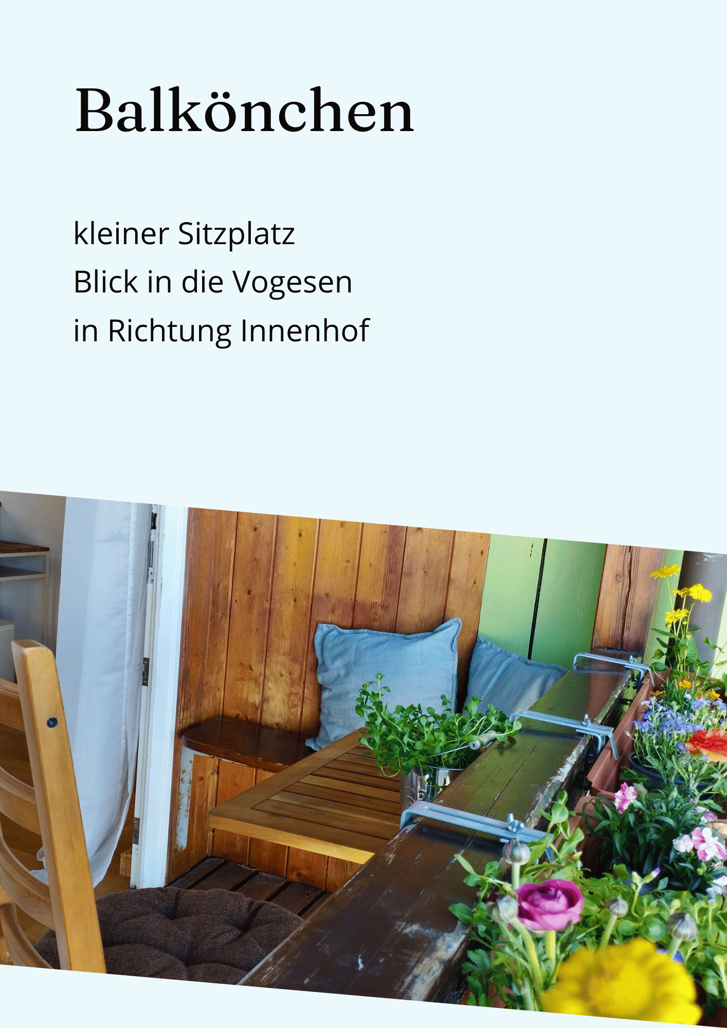 Der große lichtdurchflutete Wohn-, Ess-, Kochbereich lädt zum Verweilen ein. Eine Spielecke für Kinder sowie ein kleiner Balkon, der zum abendlichen Sonnenuntergang mit Blick in die Vogesen perfekt ist, ergänzt das Herzstück der Ferienwohnung.
