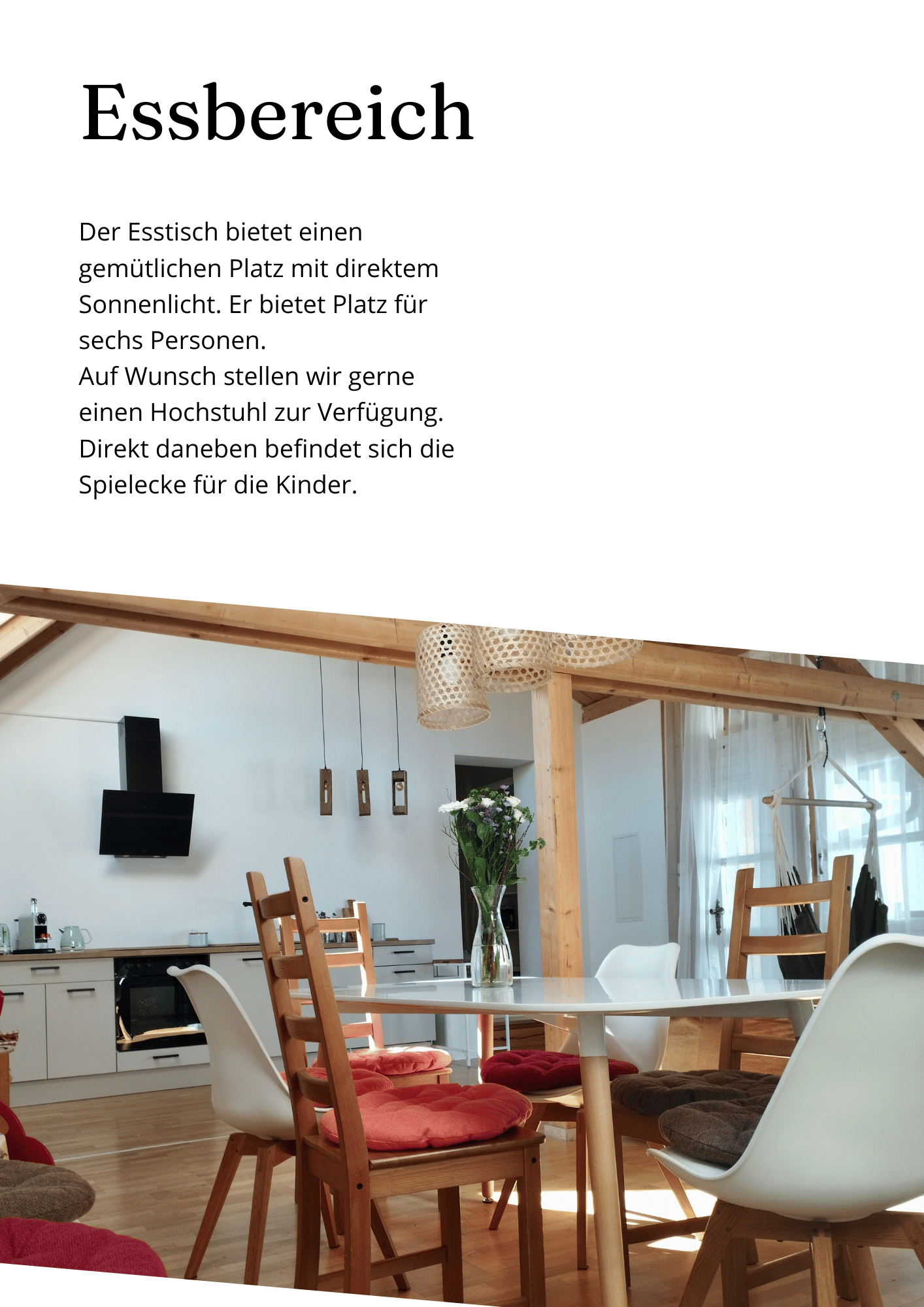 Der große lichtdurchflutete Wohn-, Ess-, Kochbereich lädt zum Verweilen ein. Eine Spielecke für Kinder sowie ein kleiner Balkon, der zum abendlichen Sonnenuntergang mit Blick in die Vogesen perfekt ist, ergänzt das Herzstück der Ferienwohnung.